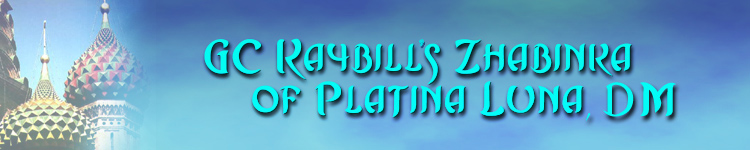 GC, RW Silverlock's Sputnik Call name: Binky Binky was born in a litter of five grand champions or grand premiers to GC, RW Roxanastasia’s Zorina Alexandra, DM which completed Zorina's DM with a total of 8 grands. Zorina’s mother and grandmother were also DMs. (A DM, or Distinguished Merit, title honors a stud that has sired 15 Grand Champions or Premiers or a queen that has produced 5 Grands and is CFA's highest breeder award). Thus, Zhabinka is a fourth-generation DM. Kay Wentling (Kaybill Cattery) remembered that we loved Zorina when she was being shown, and offered us Binky. Little did we know that Binky would become the major influence on our breeding program. She is the mother of: GC,